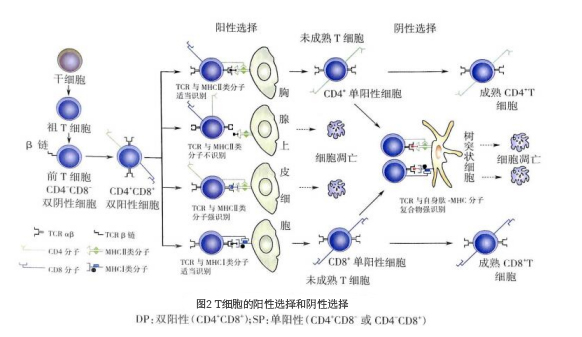 陰性選擇(negative selection)經(jīng)過陽性選擇的SP細(xì)胞在皮質(zhì)髓質(zhì)交界處及髓質(zhì)區(qū),與胸腺樹突狀細(xì)胞、巨噬細(xì)胞等表面的自身抗原肽 -MHC Ⅰ 類分子復(fù)合物或自身抗原肽 -MHC Ⅱ 類分子復(fù)合物相互作用。高親和力結(jié)合的SP細(xì)胞(即自身反應(yīng)性T細(xì)胞)發(fā)生調(diào)亡,少部分分化為調(diào)節(jié)性T細(xì)胞;而不能結(jié)合的SP細(xì)胞(陰性)存活成為成熟T細(xì)胞并進(jìn)人外周免疫器官。因此,陰性選擇的意義是清除自身反應(yīng)性T細(xì)胞,保留多樣性的抗原反應(yīng)性T細(xì)胞,以維持T細(xì)胞的中樞免疫耐受。