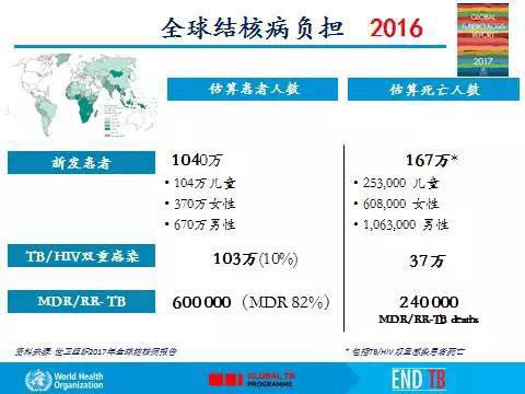 (1)2016年,1040萬人患有結(jié)核病,170萬人因該病死亡(包括40萬艾滋病毒感染者)。超過95%的結(jié)核病死亡發(fā)生在低收入和中等收入國家。