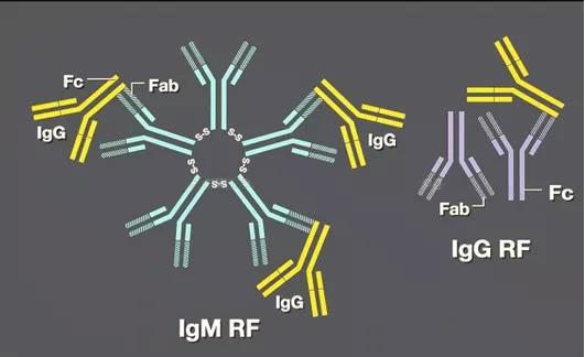 最經(jīng)典的例子是 1940 年代Waaler在某些RA患者血清中發(fā)現(xiàn)類(lèi)風(fēng)濕因子 (rheumatoid factors, RF)。在1958RF血清中呈陽(yáng)性被美國(guó)風(fēng)濕病學(xué)會(huì)納入類(lèi)風(fēng)濕性關(guān)節(jié)炎確診標(biāo)準(zhǔn)里,一起被列入確診標(biāo)準(zhǔn)的還有“晨僵”“關(guān)節(jié)活動(dòng)痛苦或壓痛”“對(duì)稱(chēng)性關(guān)節(jié)腫脹”“皮下結(jié)節(jié)”“受累關(guān)節(jié)X線(xiàn)片改變”等。但很多沒(méi)有 RA 的人也有 RF 陽(yáng)性