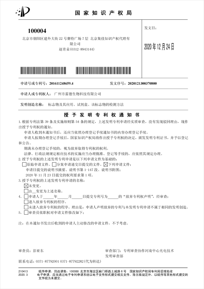其中的一件核心技術發(fā)明專利的名稱為《標志物及其應用、試劑盒、該標志物的檢測方法》,申請?zhí)枮椤?01611248659.4”,該發(fā)明于2020年12月24日獲得授權(quán),這也是我司首次在類風濕關節(jié)炎(RA)血清學“標志物”方面獲得授權(quán)的發(fā)明專利。