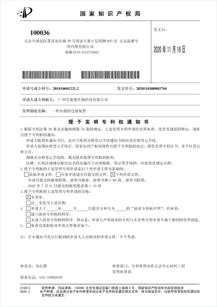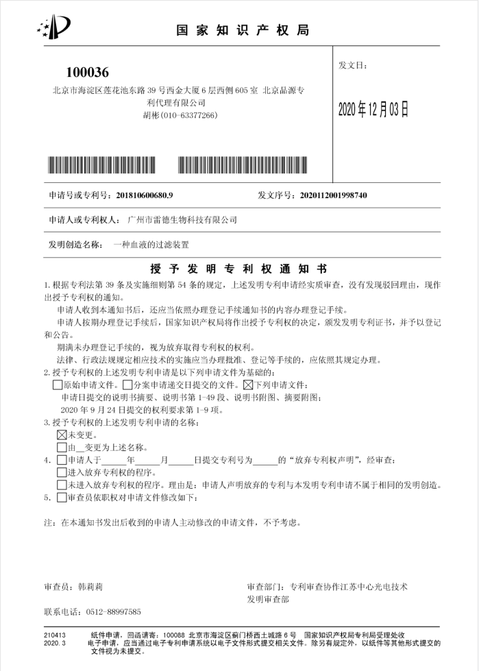 另外獲得授權(quán)的兩件核心技術發(fā)明專利名稱均為《一種血液的過濾裝置》,申請?zhí)枮榉謩e“201810601221.2”和“201810600680.9”,該兩件發(fā)明陸續(xù)于2020年11月16日與2020年12月03日獲得授權(quán)。