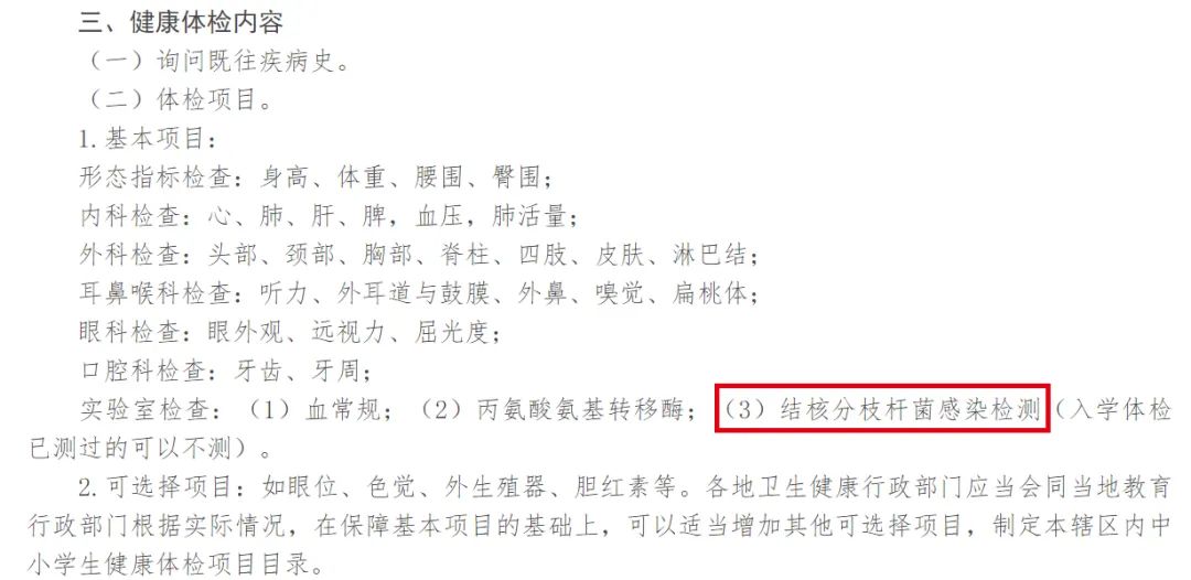 《辦法》明確規(guī)定學(xué)生健康檢查基本項(xiàng)目(也就是必檢項(xiàng)目),包括形態(tài)指標(biāo)檢查、內(nèi)科、外科、耳鼻、眼科、口腔科,以及血常規(guī)檢查、丙氨酸氨基轉(zhuǎn)移酶以及結(jié)核分枝桿菌感染檢測(cè)??梢钥闯?,《辦法》針對(duì)結(jié)核病防控提出了更高的要求: