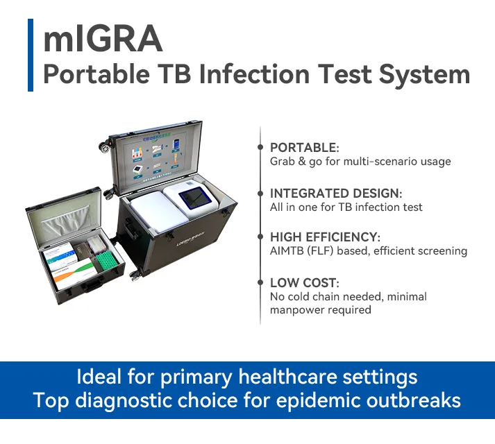 ? AIMTB檢測產(chǎn)品針對全球約20億潛伏結(jié)核感染人群開發(fā)的全球首款可移動的IGRA檢測系統(tǒng)(mIGRA,mobile IGRA)。AIMTB的全球上市,為三十多個(gè)結(jié)核高負(fù)擔(dān)國家提供了技術(shù)高度復(fù)雜的高性能IGRA技術(shù),為全球大規(guī)模LTBI篩查提供了保證。